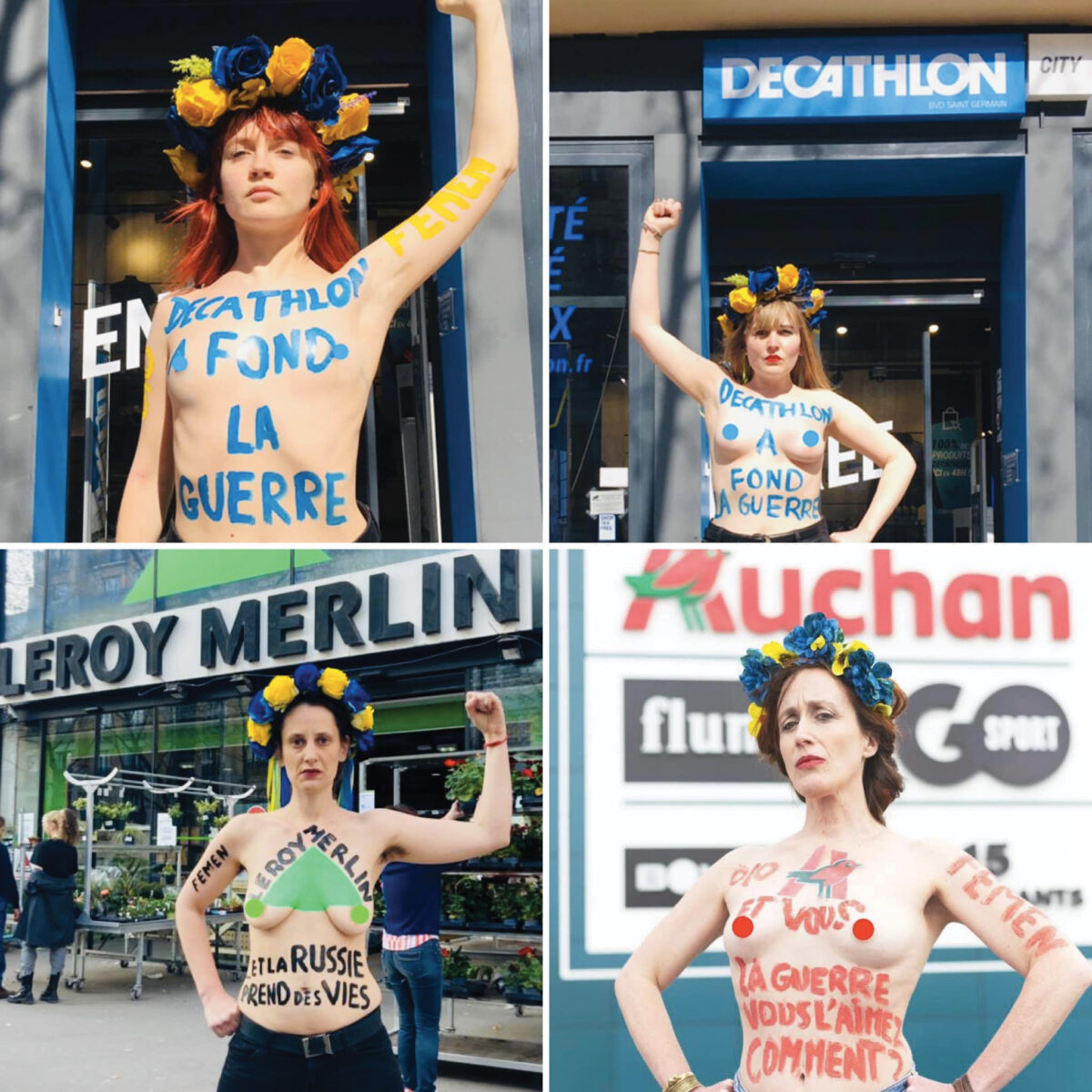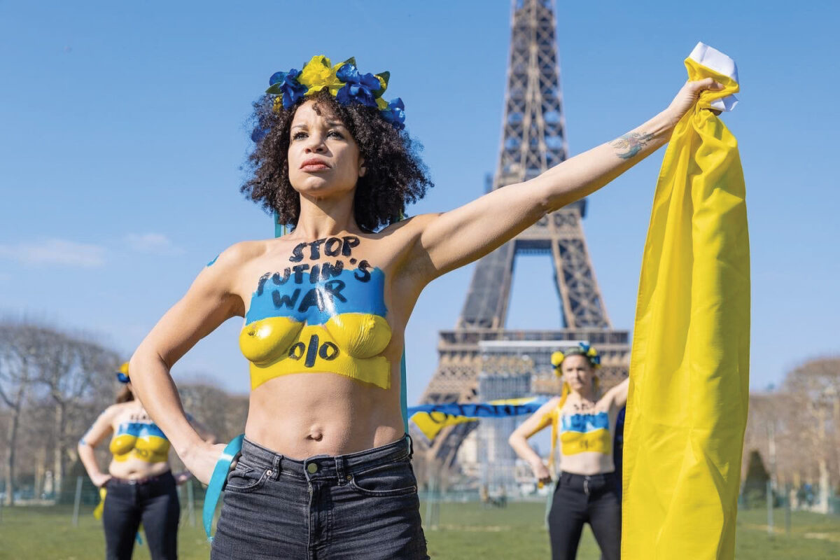 Car Inna Shevchenko est loin d’être anonyme. Ces dernières années, elle a été érigée en cheffe de file des Femen, connues dans le monde entier pour leurs actions coups de poing. Né en 2008, en Ukraine, ce mouvement féministe radical compte aujourd’hui une vingtaine d’activistes à Paris. Le 6 mars dernier, une dizaine de jours après l’invasion russe en Ukraine, elles ont manifesté au pied de la tour Eiffel. « Putin war criminal », criaient-​elles, les têtes cou­ron­nées de fleurs jaune et bleue, les pieds ancrés sur la pelouse du Champ-​de-​Mars. Surtout, elles n’avaient pas oublié leur signature et peint sur leur poitrine : « Femen against war ».