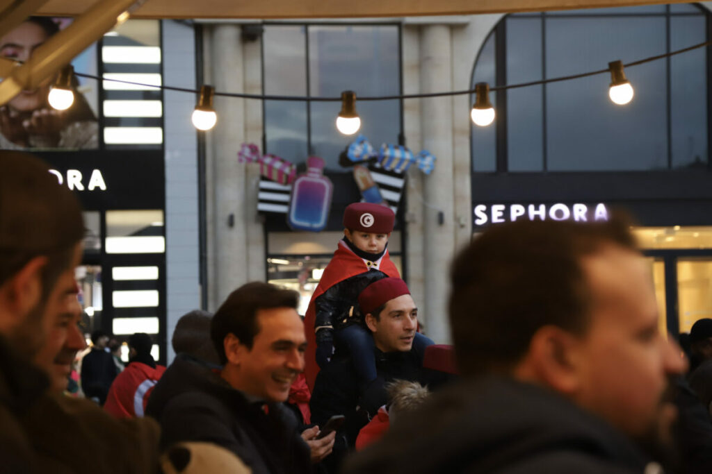 Ce qui n’était au début qu’une banale réunion au bar « La Place » s’est progressivement transformé en une superbe scène de liesse. Des supporters tunisiens qui ne faisaient que passer se sont doucement attroupés autour des premiers drapeaux rouge et blanc, vite rejoints par leurs amis. Des jeunes enfants aux plus anciens, tout le monde a fini par danser, chantant notamment l’Espérance sportive de Tunis, tout cela au rythme des tambours d’Ahmed Gorbel et de son frère. Ahmed garde pourtant la tête froide et parie même sur une défaite 3 – 1 de son équipe, avec le sourire. Pour lui ce qui compte le plus, c’est ce genre de moments.