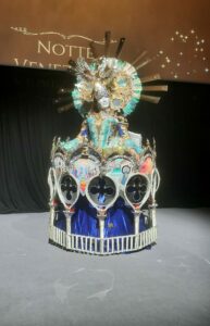 7 créateurs ont partagé leurs créations tout au long du défilé. D’Athénaïs Raux à la marque de mode Lauryne Créatrice en passant par l’Ecole d’art et de design de Nottingham, ils ont tous conquis le public. À chaque passage, des applaudissements nourris accompagnent la musique d’ambiance. Pendant 50 minutes, tous sont admiratifs des différents costumes. Robes, manteaux, masques, drapeaux, talons, bottines… il y en a pour tous les goûts. Les téléphones portables crépitent de toute part. Que ce soit par des photos et/ou des vidéos, il est impensable de ne pas immortaliser le moment. La fin a ébloui l’ensemble de l’aula maxima (salle de l’université où se déroulait l’évènement, ndlr). Une musique commence, la lumière se concentre sur le milieu du rideau. Celui-ci s’ouvre et apparait une silhouette imposante. Sa beauté et son éclat rendent les admirateurs bouche bée. Même si l’entrée n’a pas été celle espérée (le chapeau était un peu trop haut pour passer, d’un coup, le plafond du mur de scène), Karen, reine du carnaval de Venise, capte toute l’attention. L’esprit de Venise s’ancre définitivement puis vient l’heure des commentaires, autour d’un buffet garni de petits fours et d’un gala se voulant « dansant ». Les classiques de la musique italienne « Ti amo » et « Sara perché ti amo » résonnent alors dans la salle. Lille, aviez-vous dit ?