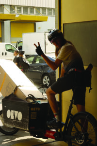 Si Des Bras En Plus s’est saisi du vélo cargo comme d’un complément pour son offre de déménagement, Olvo l’épouse entièrement. L’activité de la coopérative consiste à livrer auprès des commerçants leurs commandes. Grâce à des points de collecte bien répartis et à une logistique bien rodée, Olvo parvient à concurrencer la camionnette comme modèle de livraison.