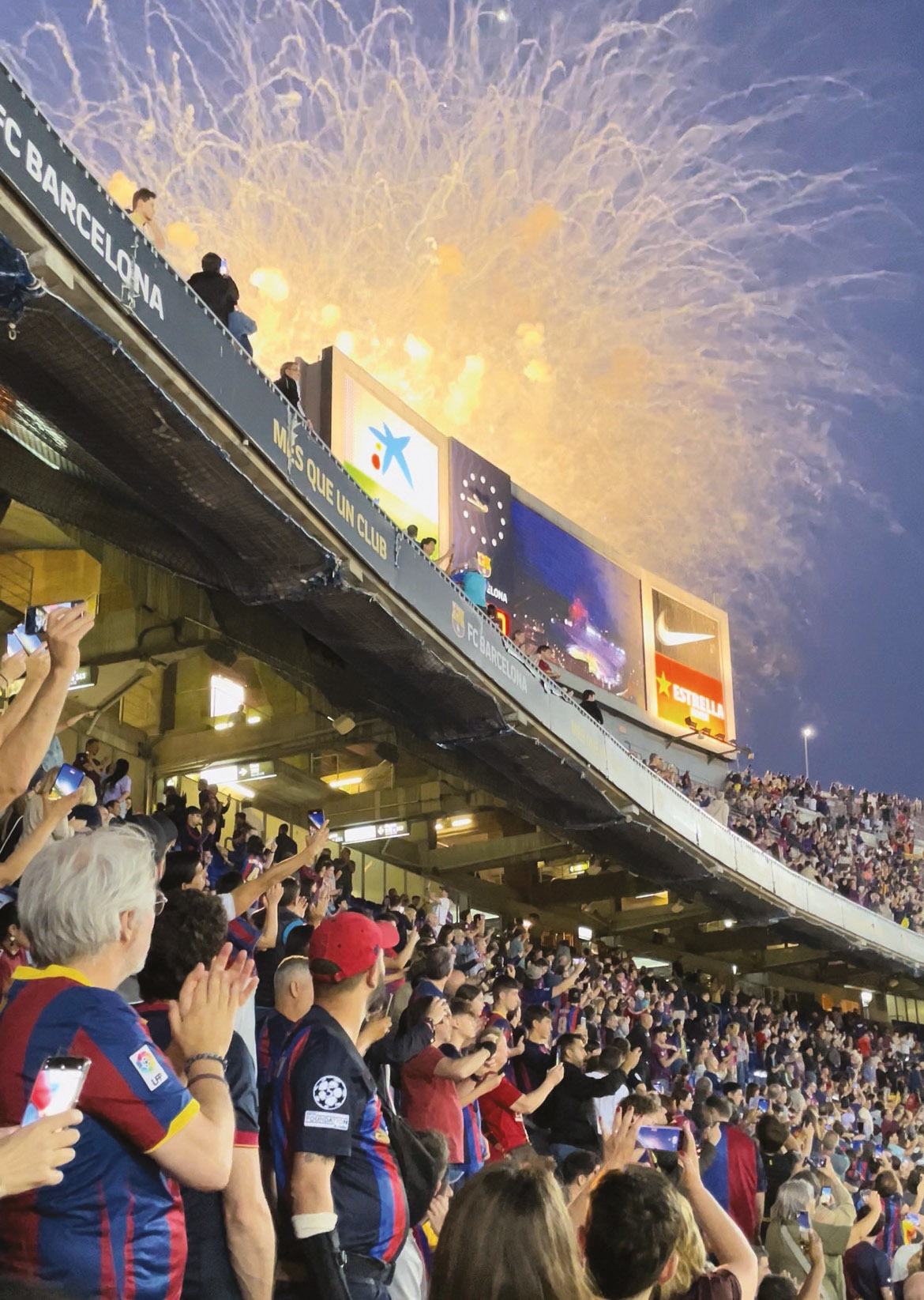 Pour Jordi Delgado Mora, jour­na­liste au Diario Sport, le Camp Nou n’est pas qu’un écrin de football : « C’est un sanc­tuaire collectif, un espace de cohésion où toutes les géné­ra­tions, toutes les classes sociales et toutes les origines se mélangent sans dis­tinc­tion. » Chaque victoire prend la forme d’une célé­bra­tion populaire. Les soirs de triomphe, la foule converge vers la Font de Canaletas, sur la Rambla, pour communier autour de son club. « Cette tradition de Canaletas, c’est notre Madeleine de Proust col­lec­tive, c’est l’histoire d’un peuple qui se retrouve autour de son club, géné­ra­tion après géné­ra­tion » confie Delgado Mora. Mais le lien entre football et identité ne se limite pas aux souvenirs. Le 1er octobre 2017, jour du réfé­ren­dum d’indépendance interdit par Madrid, le Barça devait affronter Las Palmas. Refusant de reporter la rencontre, la Ligue imposa un match sans spec­ta­teurs. « Ce jour-​là, le silence du Camp Nou résonnait comme un cri » se remémore Delgado Mora. « Les joueurs ne voulaient pas jouer. Ils ont prit la parole, les larmes aux yeux, c’était un moment d’histoire, de douleur, mais aussi d’unité ».