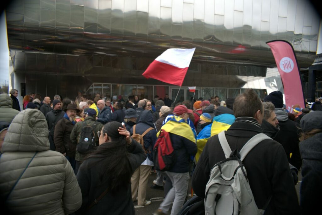 Puis près des gerbes de fleurs, les couleurs de l’Ukraine se mêlent à celles de la Pologne, dont les res­sor­tis­sants sont plus soudés que jamais avec les Ukrainiens. Les gens sont restés encore un peu après pour se serrer dans les bras et brandir toujours plus haut les messages de contes­ta­tion « Kherson, c’est l’Ukraine », « arrêtons les Russes » et les photos de proches disparus.