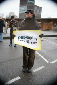 Une pro­tes­tante ukrai­nienne, une pancarte à la main sur laquelle est écrit : « Kherson c’est l’Ukraine » ©Manon Manceau