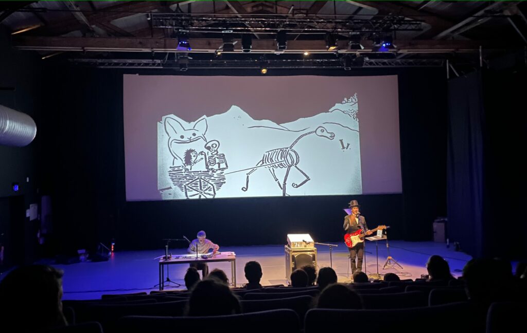 Au cinéma de la gare Saint-Sauveur, le brouhaha des enfants a laissé place à la voix de Denis Baronnet, ainsi qu’au son de sa guitare électrique. À ses côtés, le dessinateur Gaëtan Dorémus donnait vie à Garance et Skeletos sous ses coups de crayon projetés derrière lui. C’est au cœur du festival des livres d’En Haut, et pour la sortie de leur BD jeunesse « Skeletos », que l’auteur Denis Baronnet et son binôme Gaëtan Dorémus se sont adonnés à une « lecture dessinée et musicale ». La 5e édition de ce rendez-vous littéraire des Hauts-de-France s’est tenue du 3 au 5 octobre à Lille.