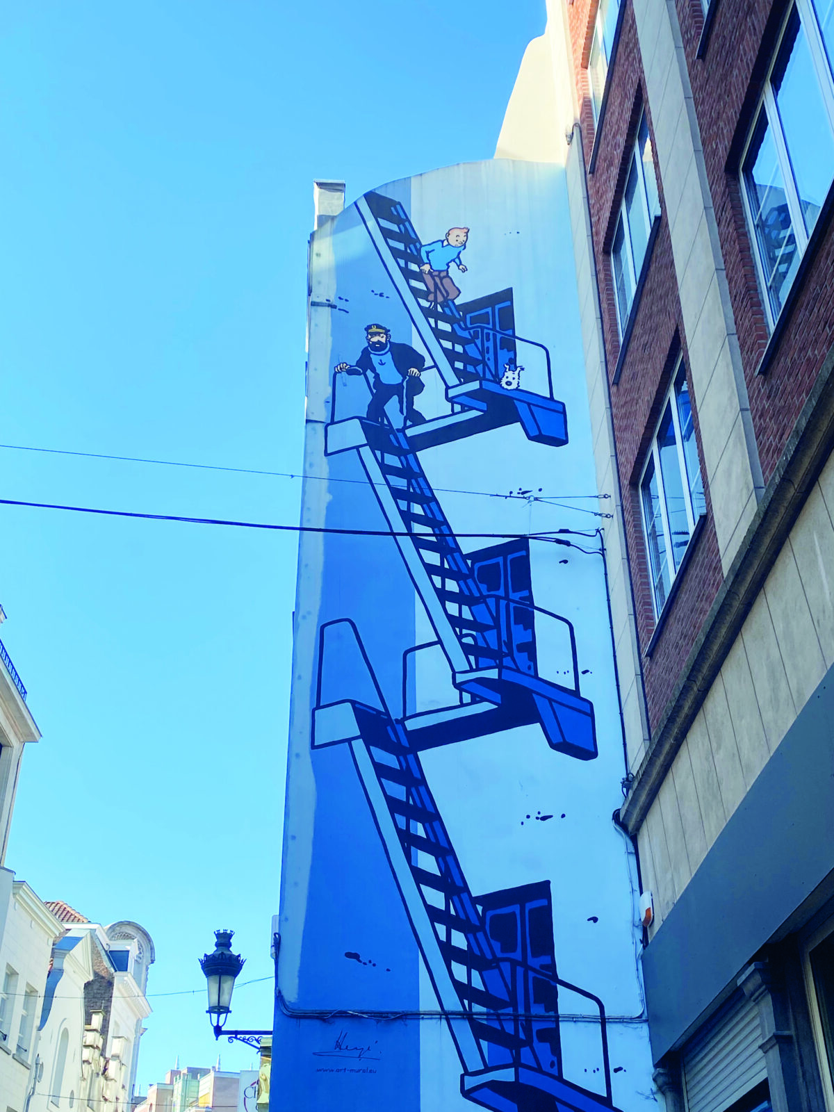 Sous un soleil éclatant, nous avons parcouru les rues du centre-ville de Bruxelles à la découverte des fresques géantes qui ornent les murs de la capitale. Ici, il suffit de lever les yeux pour voir Tintin filer à toute vitesse sur les murs d’une ruelle, Gaston Lagaffe somnoler au-dessus d’une rue animée ou Spirou bondir entre deux immeubles. Chaque coin de rue offre une nouvelle bulle de bande dessinée. Pour voir la plus célèbre, celle de Tintin, rendez-vous au 37 rue de l’Étuve.